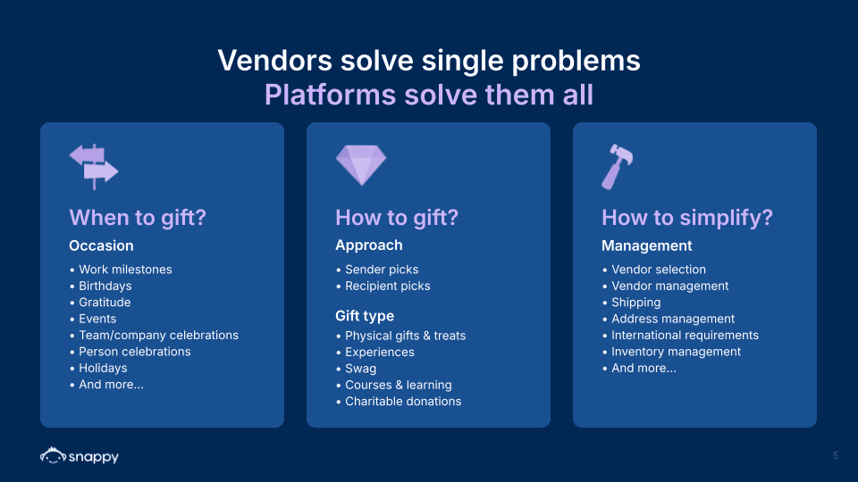 Customer research revealed that customers only focused on pain in isolated gifting campaigns. We helped Snappy shift the narrative to the complexity of gifting across the employee lifecycle.